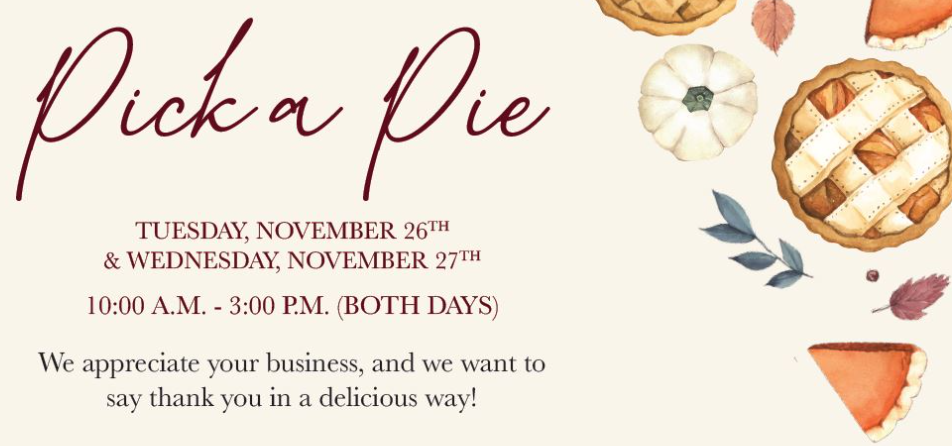 Swing by and pick up a FREE pie as our way of saying thank you for your continued support. Whether you're craving a taste of fall or just want to enjoy a cozy treat, we've got a pie with your name on it!